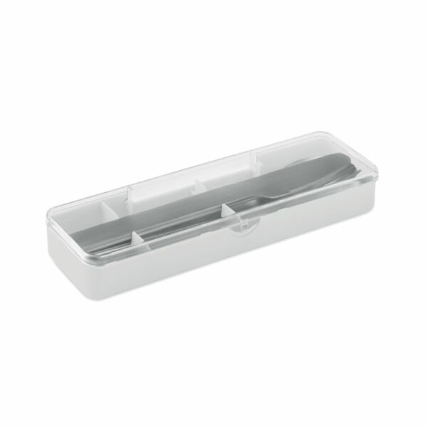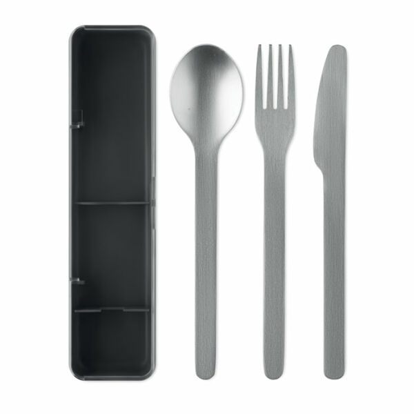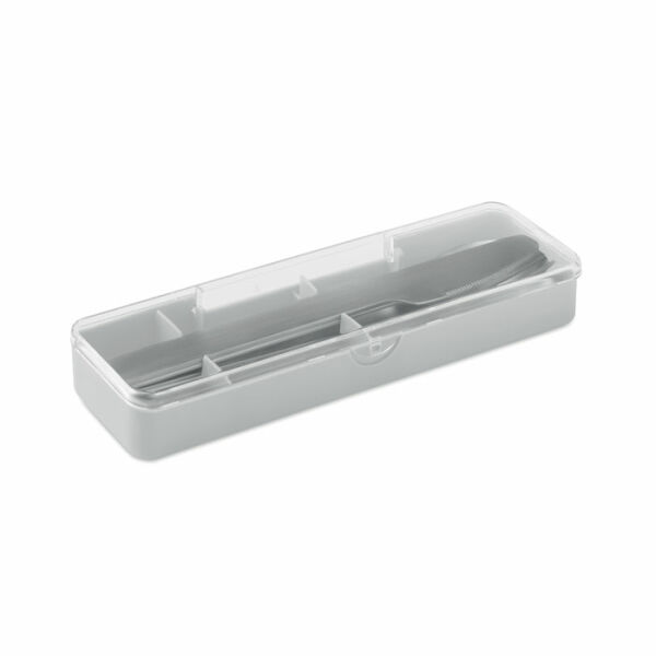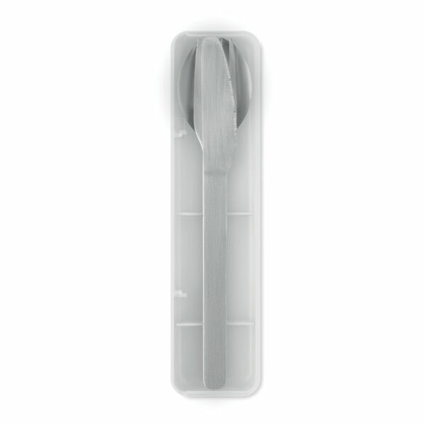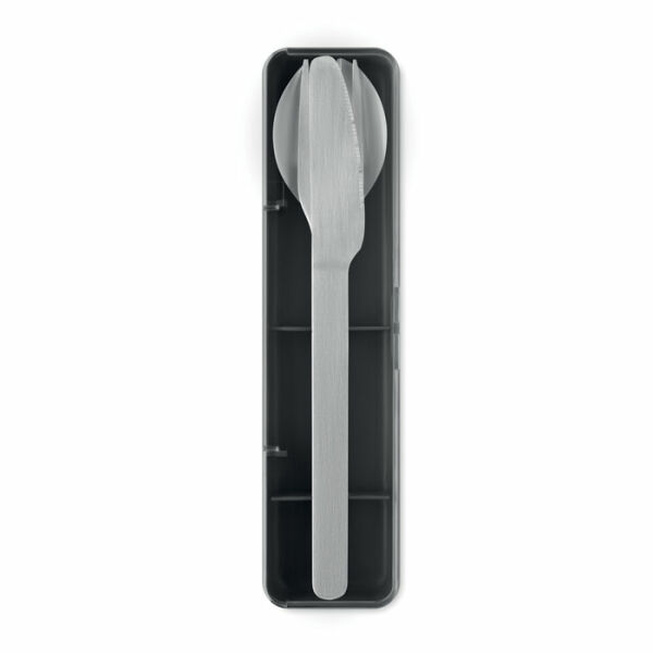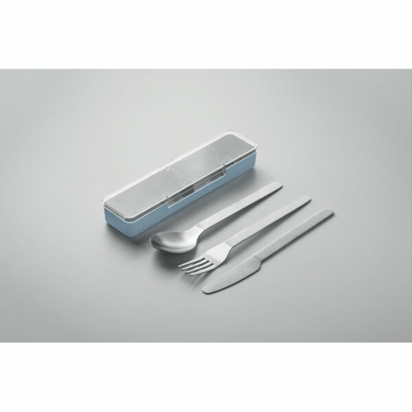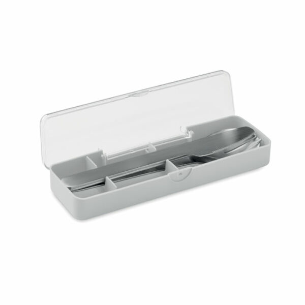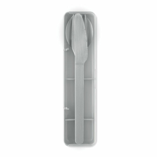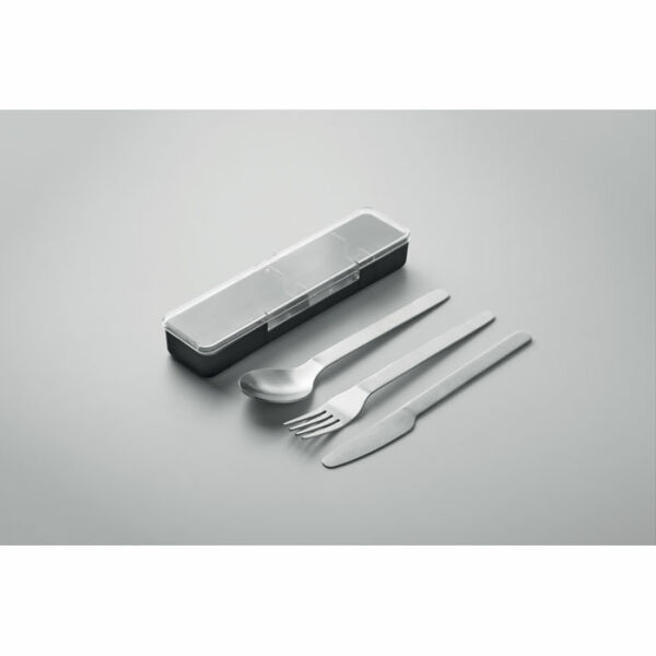 Roestvrijstalen bestekset met PP etui. Deze set bevat een vork, mes en lepel.
